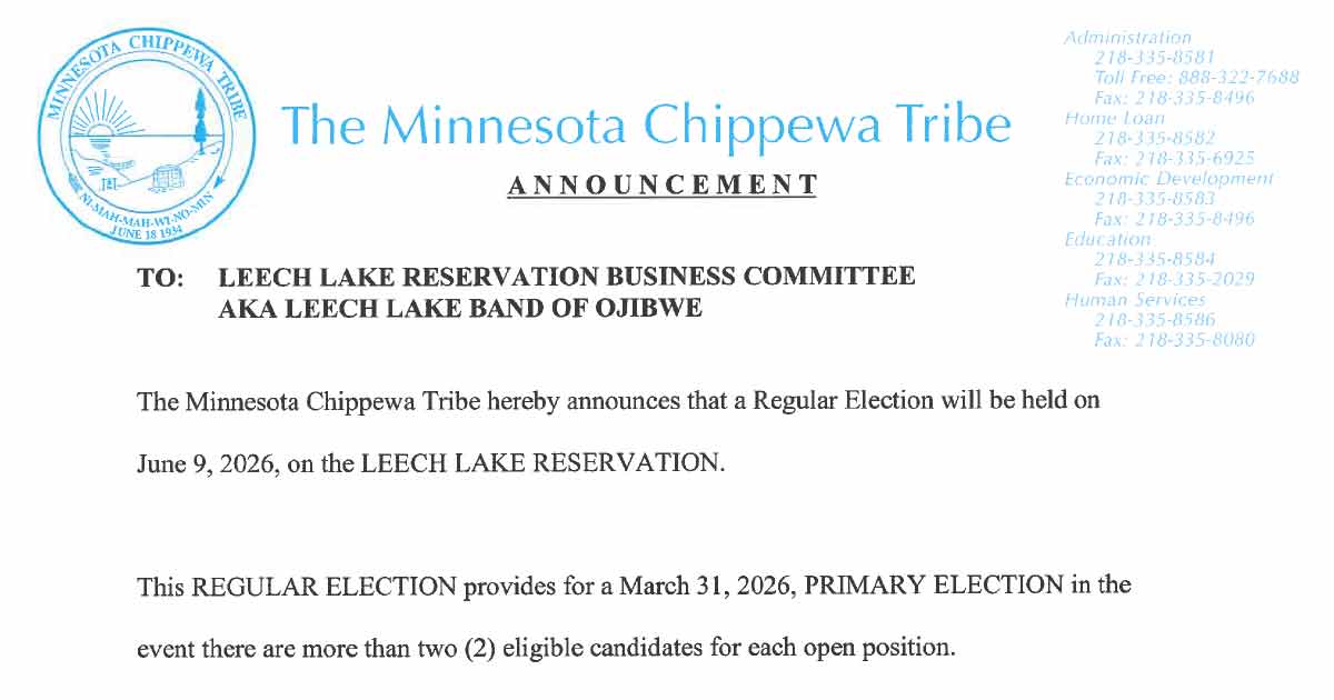 The Minnesota Chippewa Tribe hereby announces that a Regular Election will be held on June 9, 2026, on the LEECH LAKE RESERVATION.