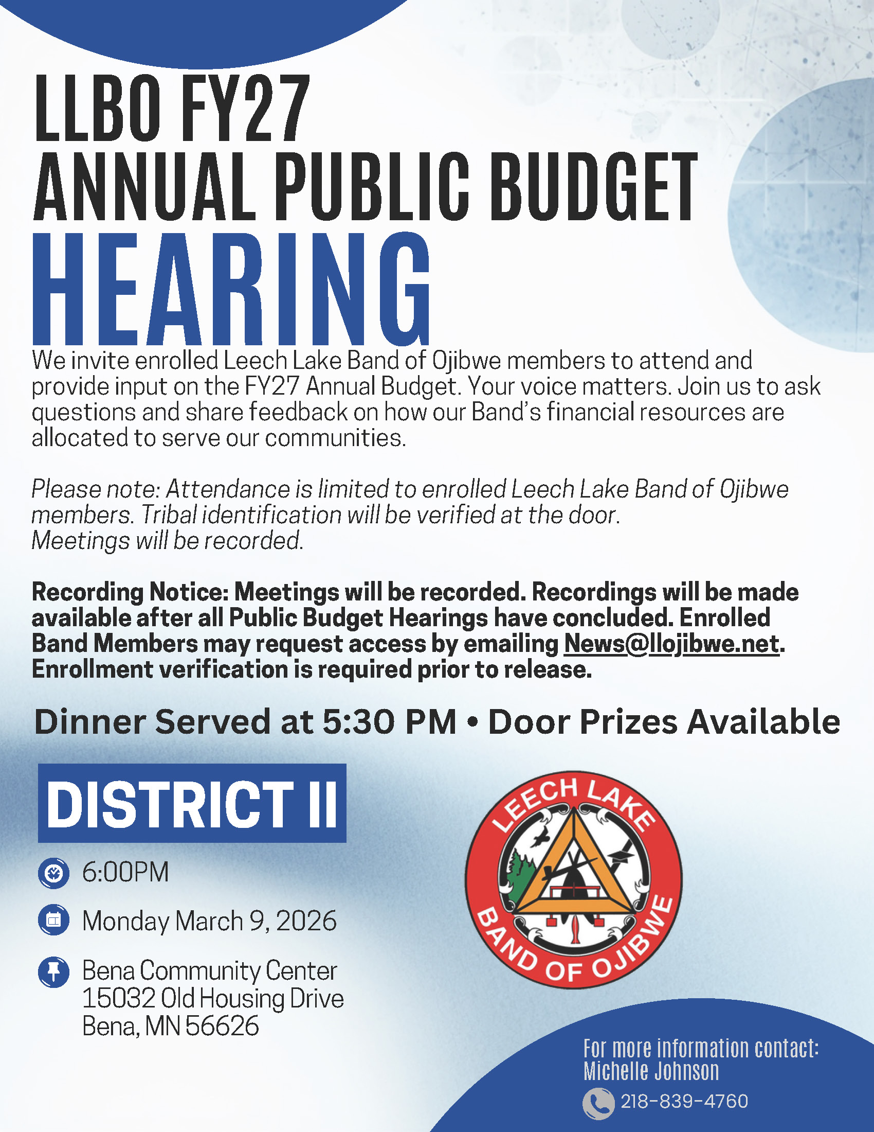 The Leech Lake Band of Ojibwe invites enrolled Band members to attend the FY27 Annual Public Budget Hearings. Your voice matters. Join us to ask questions and share feedback on how our Band’s financial resources are allocated to serve our communities.