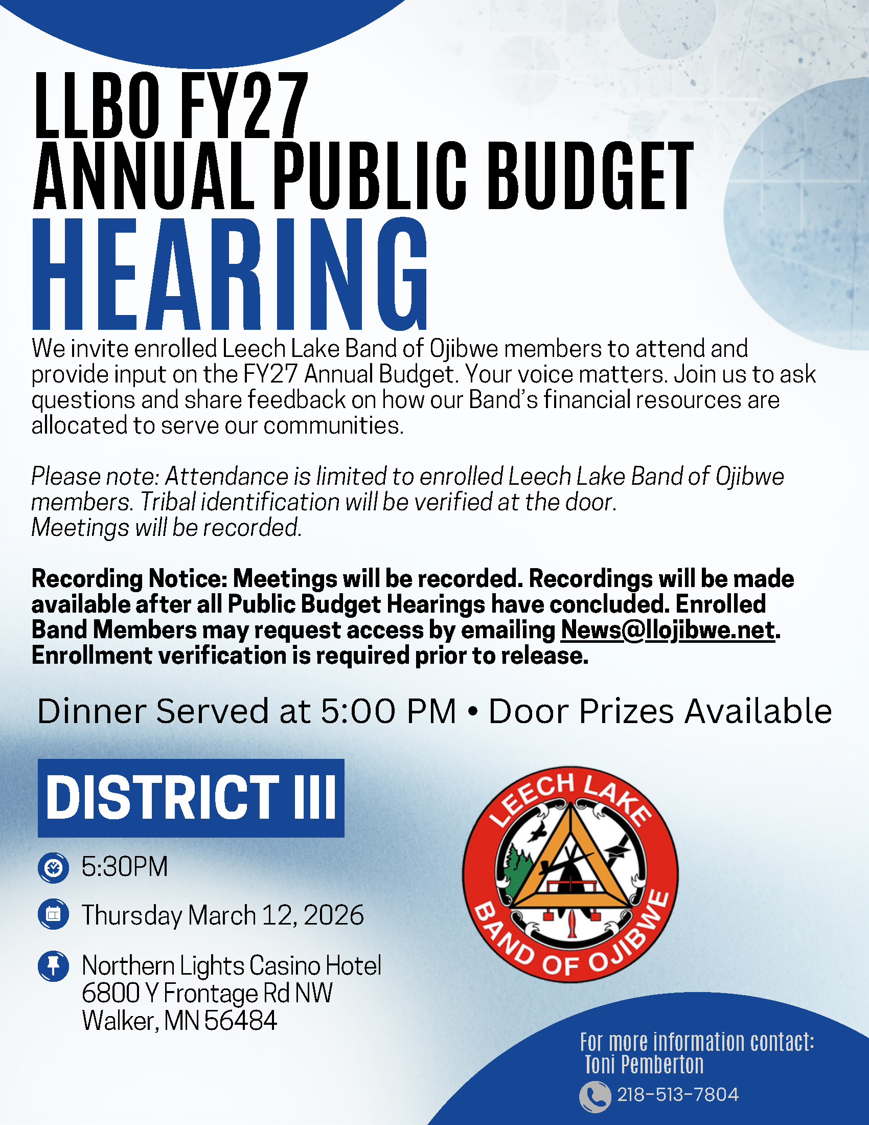 The Leech Lake Band of Ojibwe invites enrolled Band members to attend the FY27 Annual Public Budget Hearings. Your voice matters. Join us to ask questions and share feedback on how our Band’s financial resources are allocated to serve our communities.