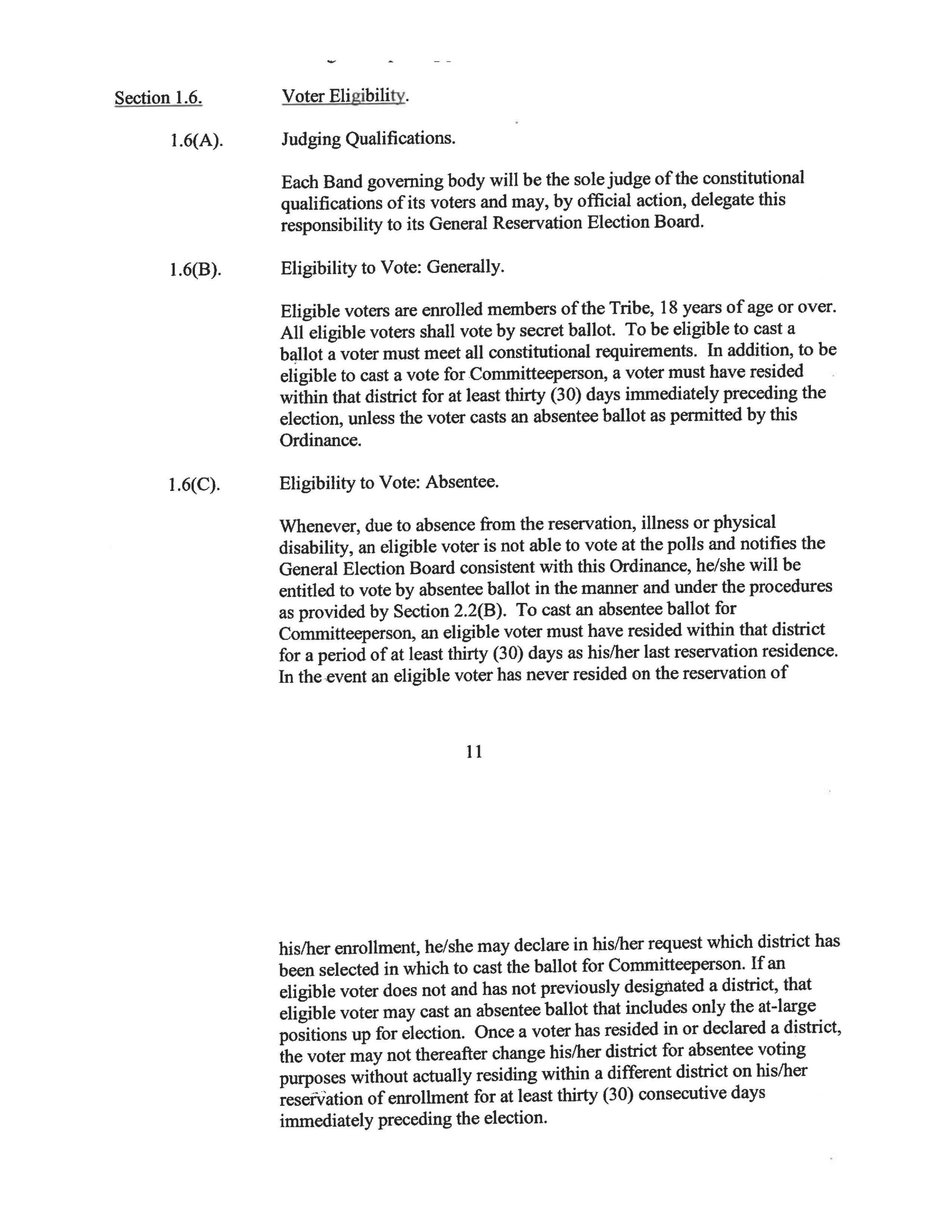 Eligible voters are enrolled members of the Tribe, 18 years of age or over. All eligible voters shall vote by secret ballot. To be eligible to cast a ballot a voter must meet all constitutional requirements. In addition, to be eligible to cast a vote for Committeeperson, a voter must have resided within that district for at least thirty days immediately preceding the election, unless the voter casts an absentee ballot as permitted by this ordinance.