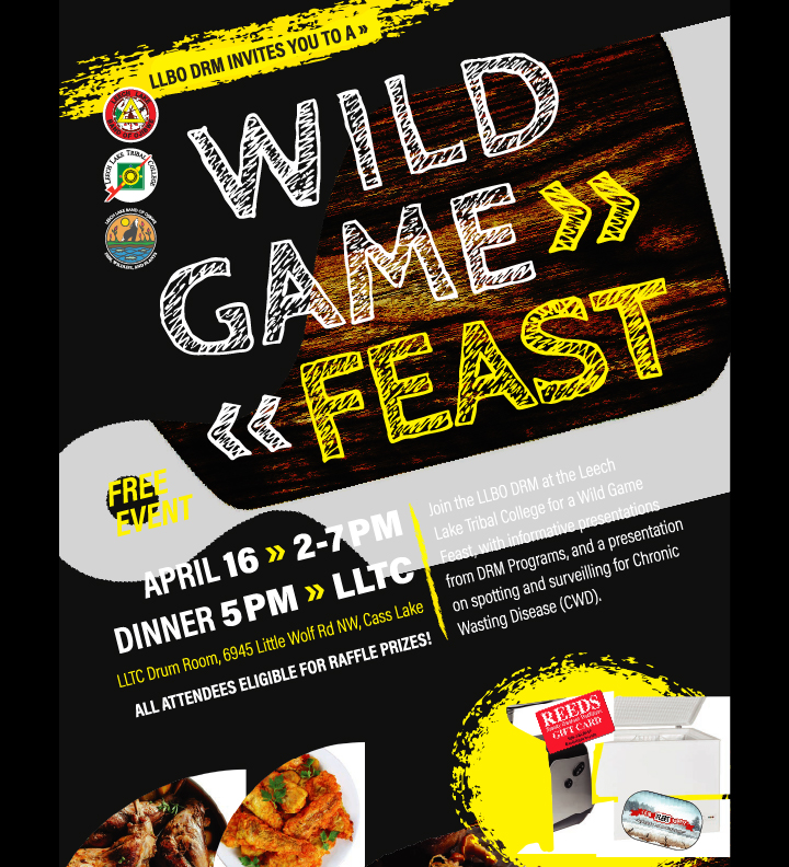 Join the LLBO DRM at Leech Lake Tribal College for a Wild Game Feast. The event will include informative presentations from DNR programs, plus a session on spotting and surveillance for Chronic Wasting Disease (CWD).