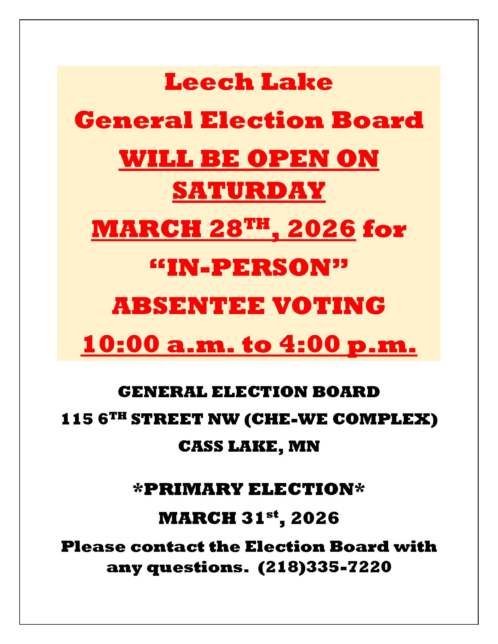 The Leech Lake Band of Ojibwe General Election Board is now available for "In-Person" absentee voting. Monday - Friday 8:00 am - 4:30 pm Location: 115 6th Street NW (che-we complex) Any questions, please reach out to Election Board (218) 335-7220