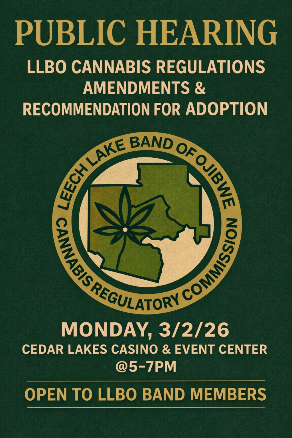 The Leech Lake Band of Ojibwe Cannabis Regulatory Commission will host a public hearing to review proposed amendments to the LLBO Cannabis Regulations and present its recommendation for adoption. Band members, community members, cannabis industry stakeholders, and the general public are encouraged to attend, learn about the proposed changes, ask questions, and share input. Date: […] |